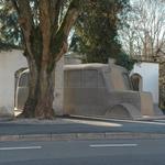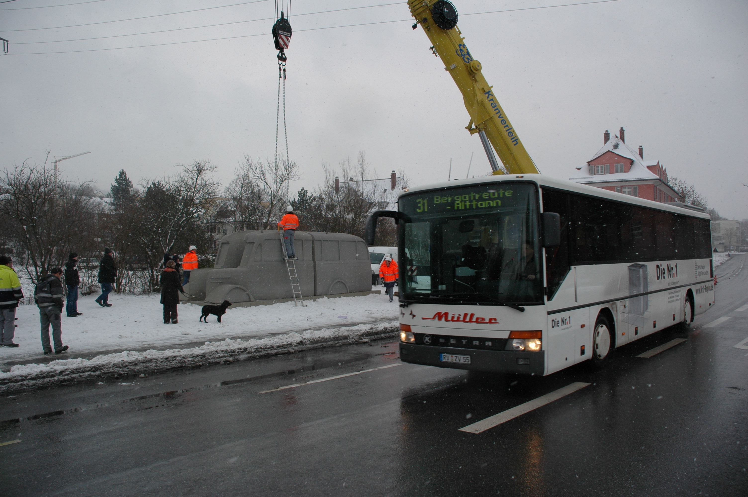 Aufstellen des zweiten Busses Datum 04.02.2007 Der zweite 70 Tonnen schwere Beton-Bus wird am 27. Januar 2007 in der Ravensburg, Gartenstraße aufgebaut. Er wird dort für etwa ein bis zwei Jahre stehenbleiben.