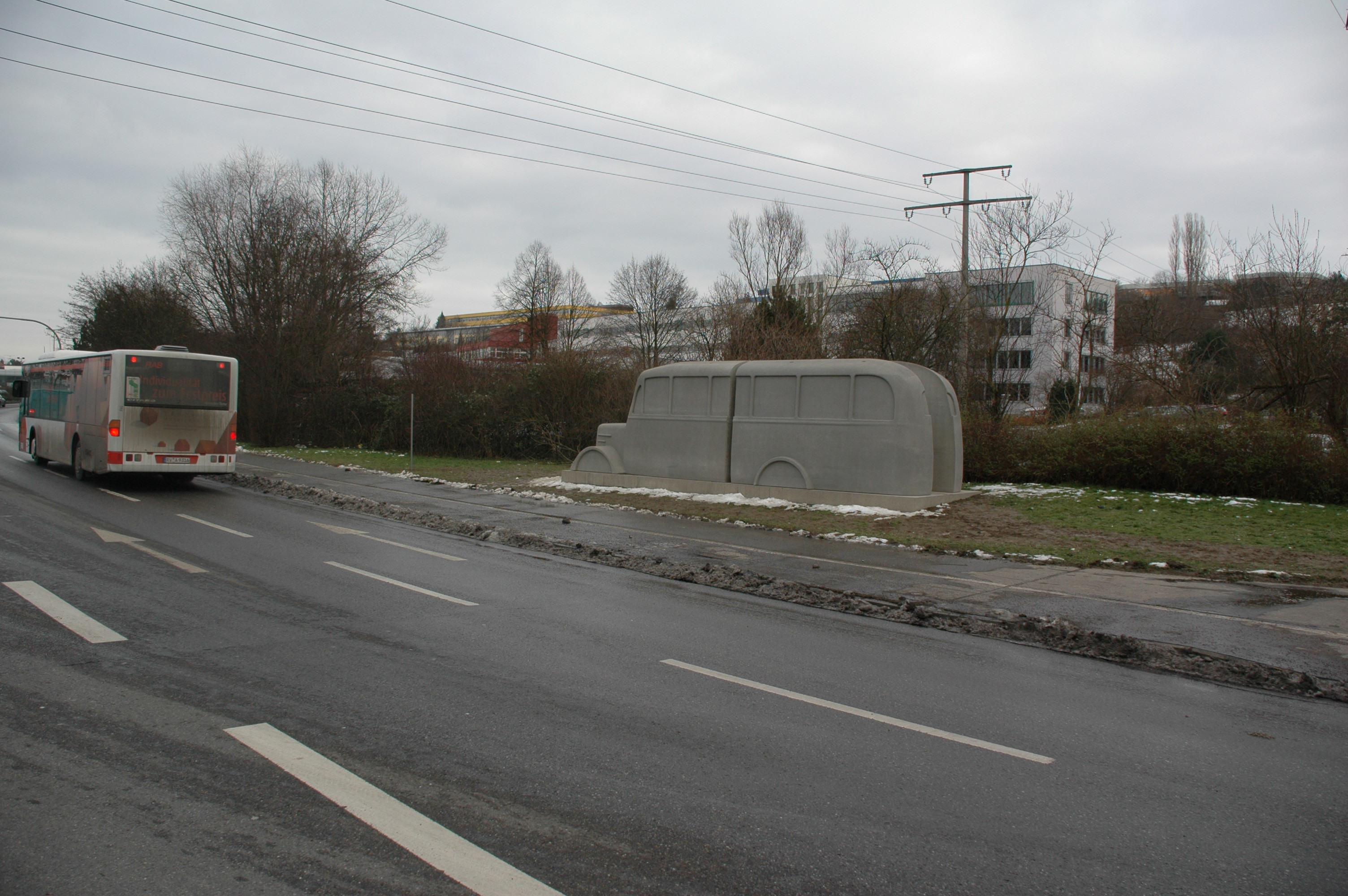 Bus und Bus Datum 23.01.2007 Fest installiert steht der Beton-Bus als plakativer Realismus unübersehbar an der Schnittstelle Klinik zur Stadt und provoziert Fragen in jeder Generation. Es ist kein unscheinbarer Gedenkstein im Klinikgelände, sondern