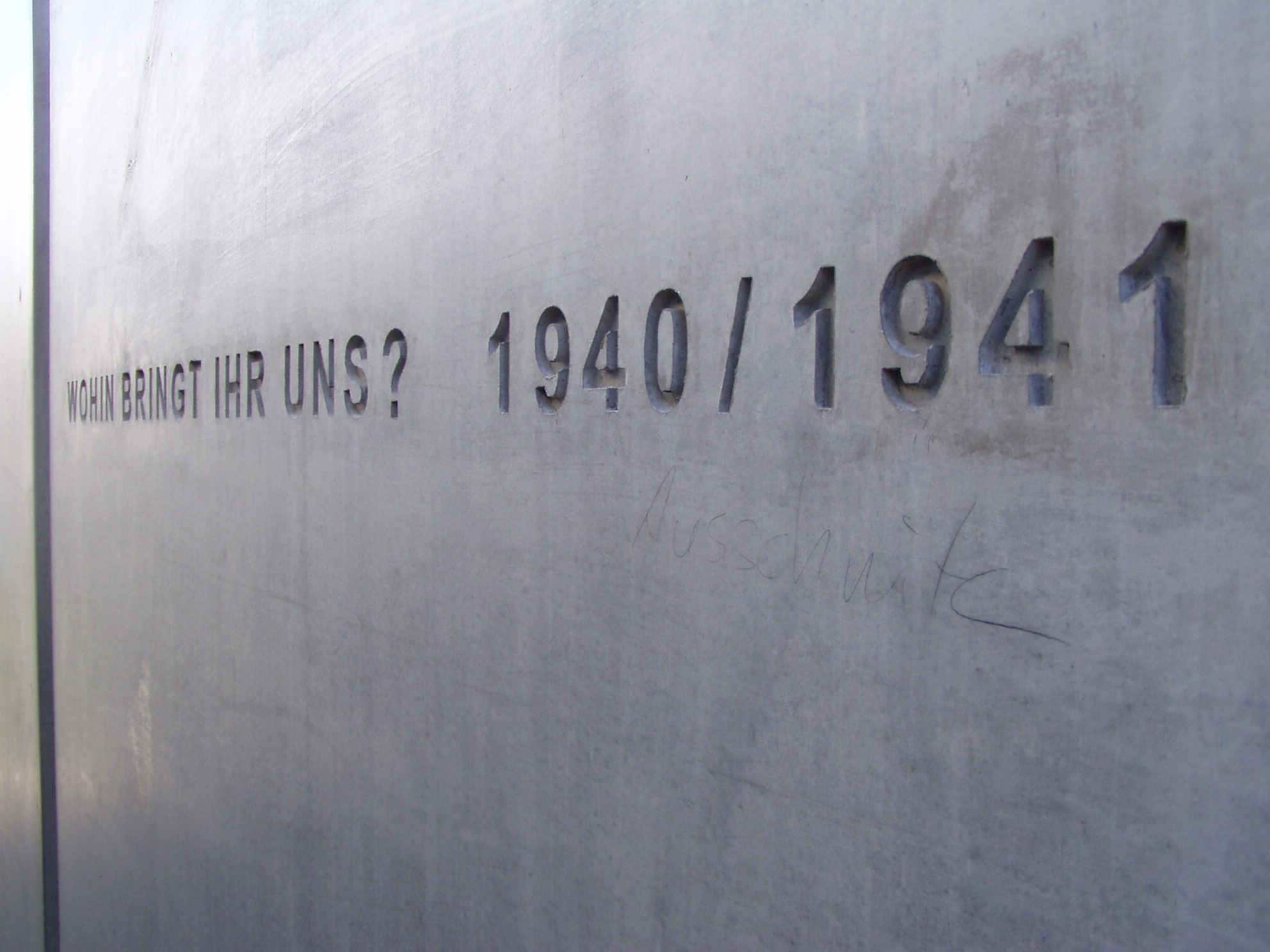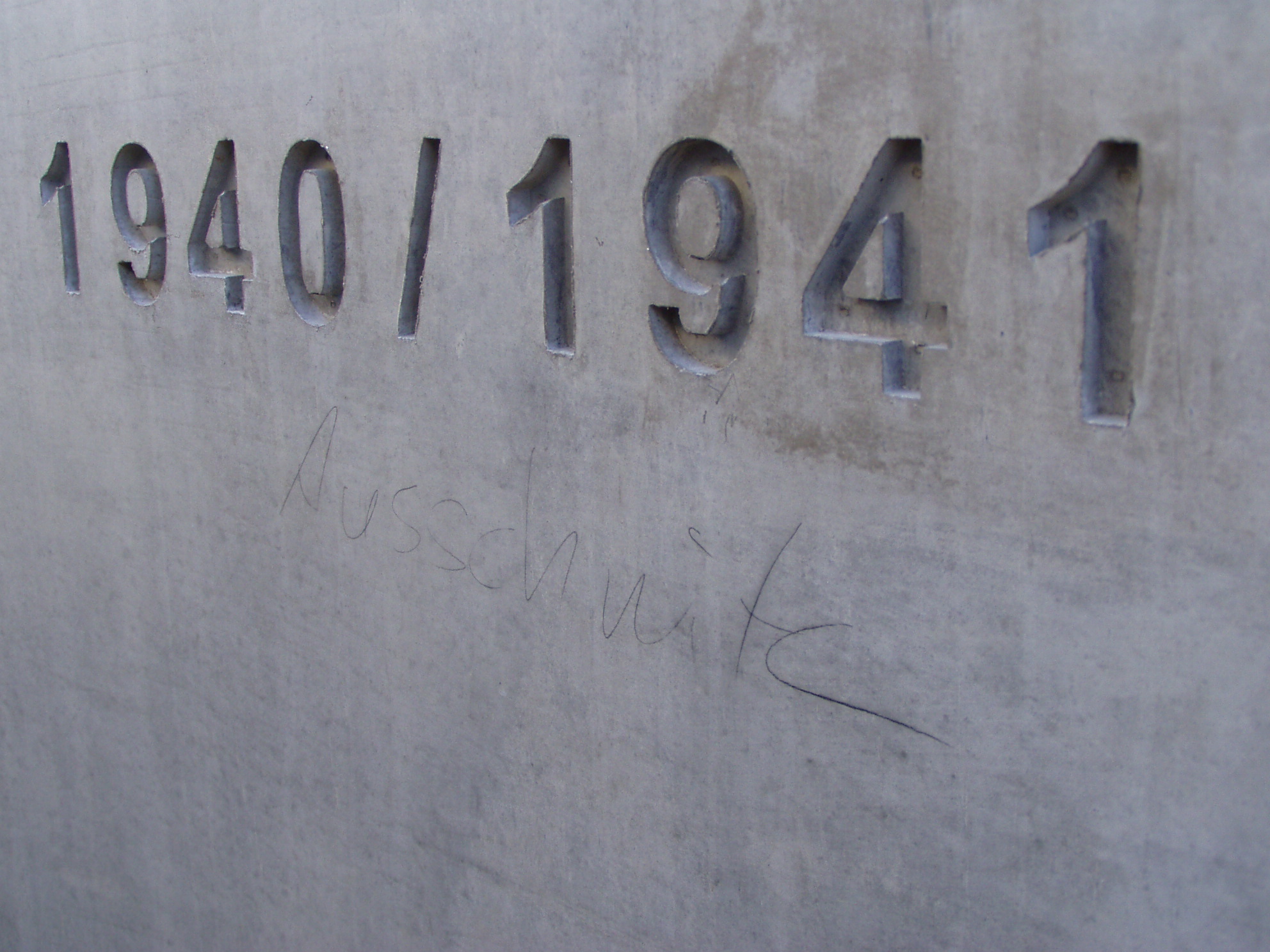 ist nun 2007 auf dem Bus in der GArtenstraße mit Bleistift eine Antwort auf die Betonfläche geschrieben worden: AUSSCHWITZ