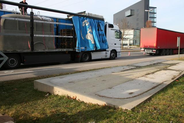 Zweiter Bus Datum 04.02.2007 Der zweite 70 Tonnen schwere Beton-Bus in Ravensburg, Gartenstraße.