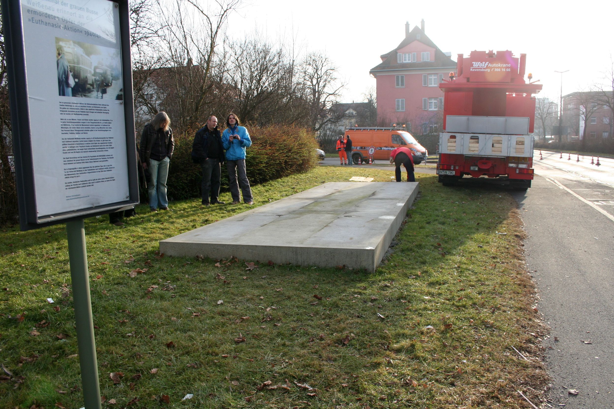 Aufstellen des Denkmal-Busses Datum 23.01.2007 Der 70 Tonnen schwere Beton-Bus wird in dem nach vielen Jahren wieder geöffneten Tor der Alten Klinik-Pforte fest installiert. So wird nach dem Wieder-Öffnen gleichzeitig das Tor dauerhaft blockiert. Nur ein Mittelgang durch den Beton-Bus ist als neuer Zugang für Besucher des Denkmals begehbar.