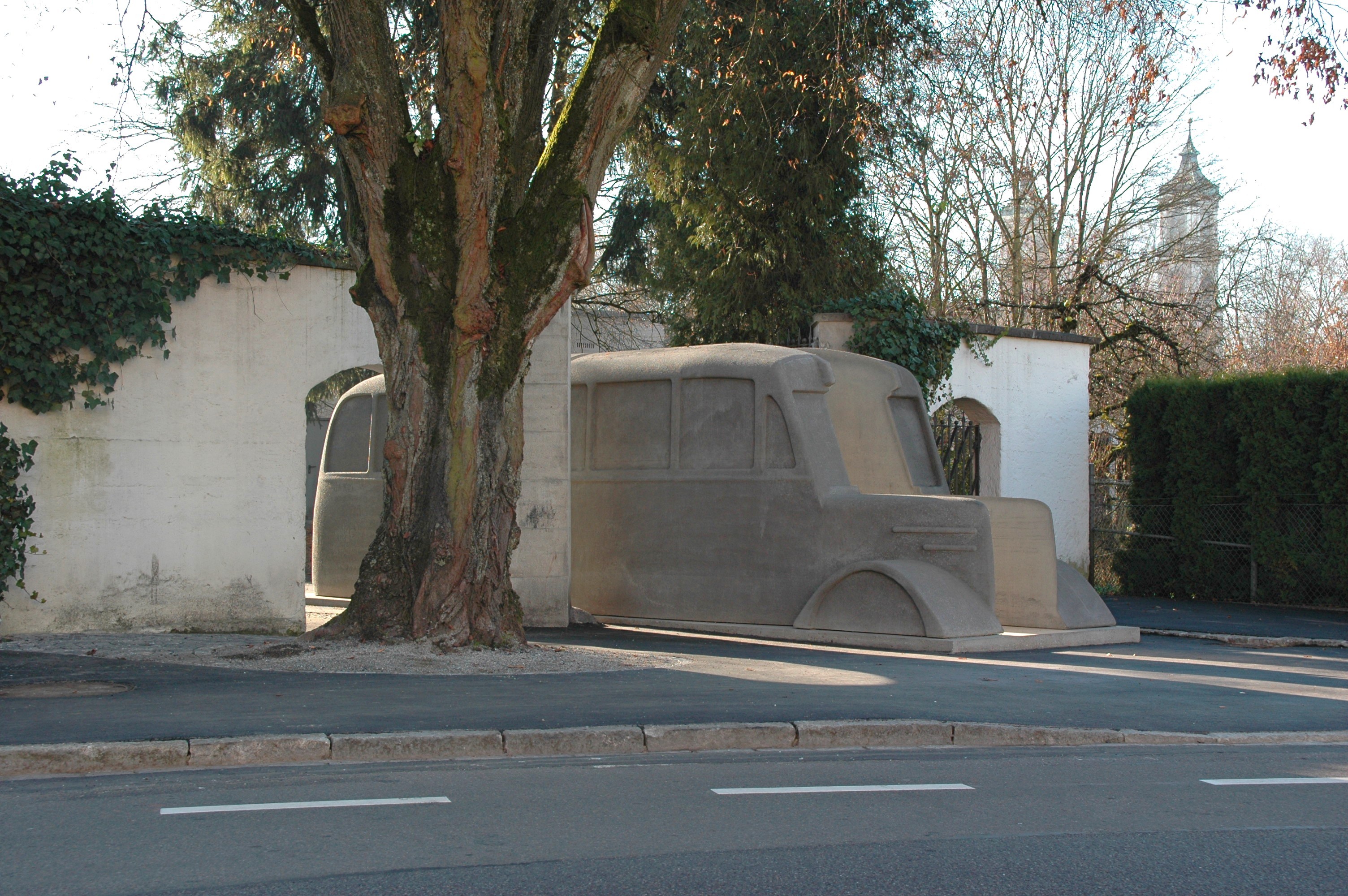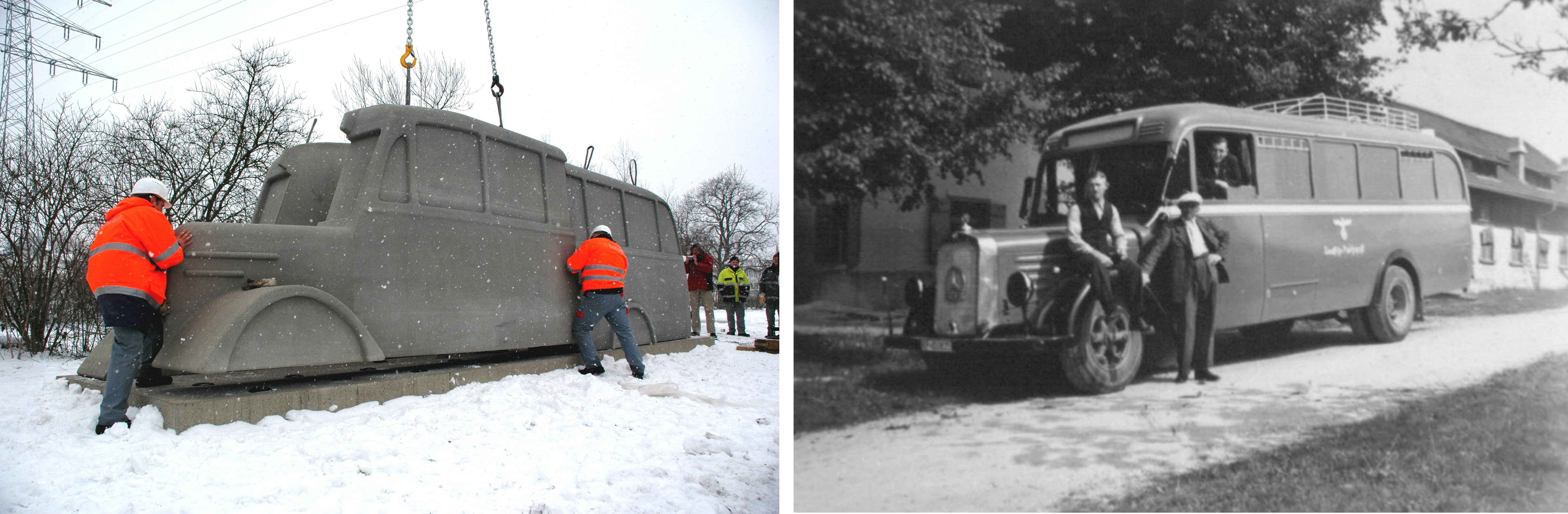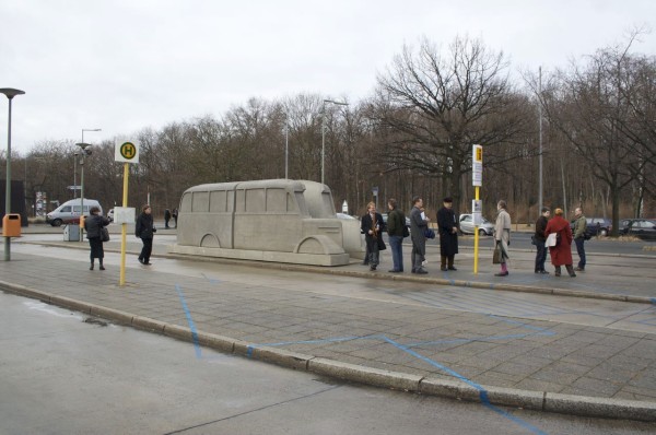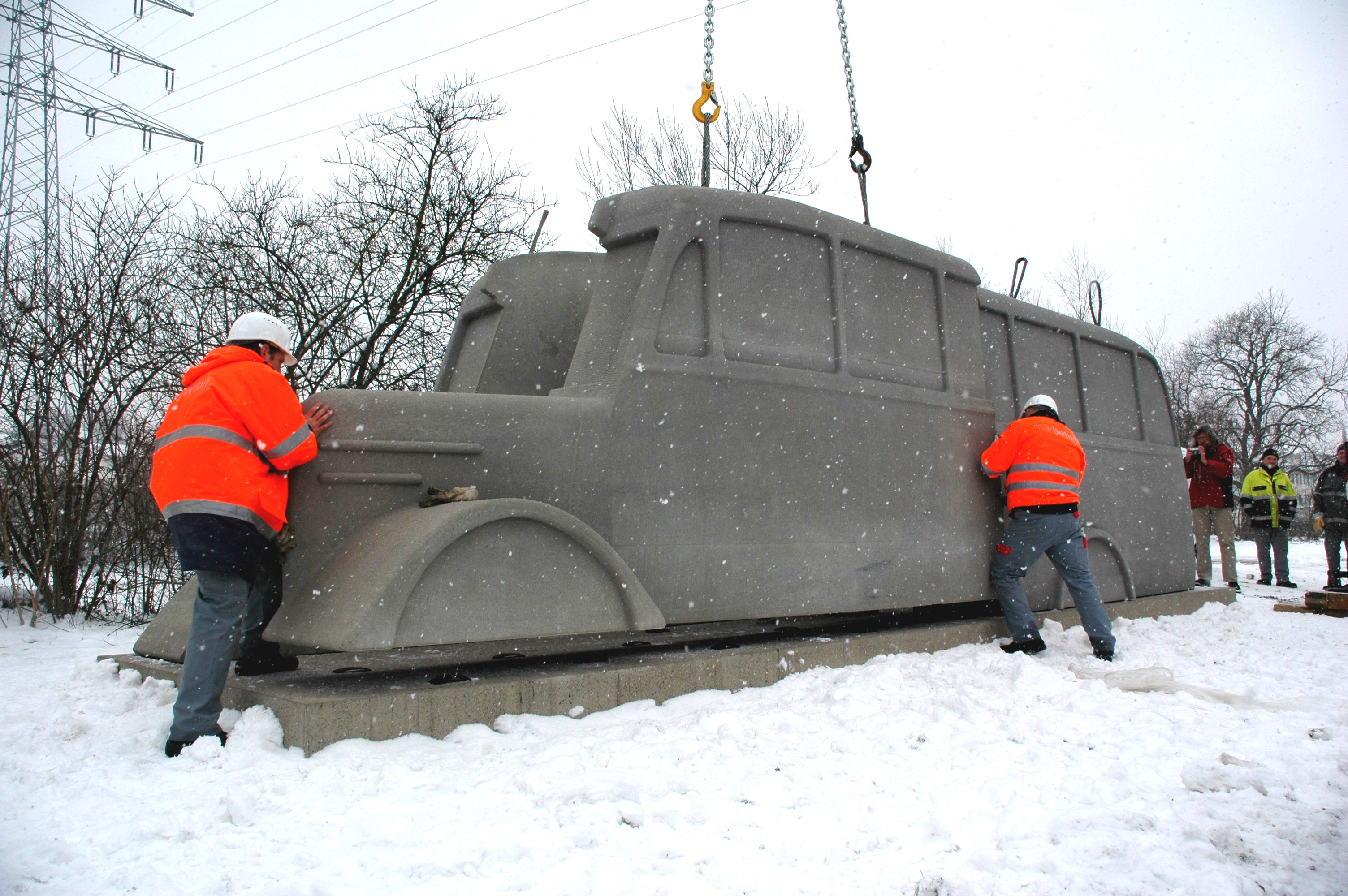 Der Denkmal-Bus steht hier seit November 2006 fest installiert. Ein zweiter baugleicher Beton-Bus wechselt seinen Standort über die Jahre.